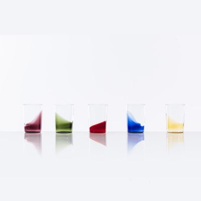 Asimmetrie di colore, che danno ritmo ai vari elementi, contraddistinguono i bicchieri e la bottiglia del “Servizio Pezzente” di Venini realizzati in vetro di Murano. Una collezione di inediti realizzati a partire da disegni originali di Gio Ponti del 1946-47. I bicchieri, che presentano delle ? ...